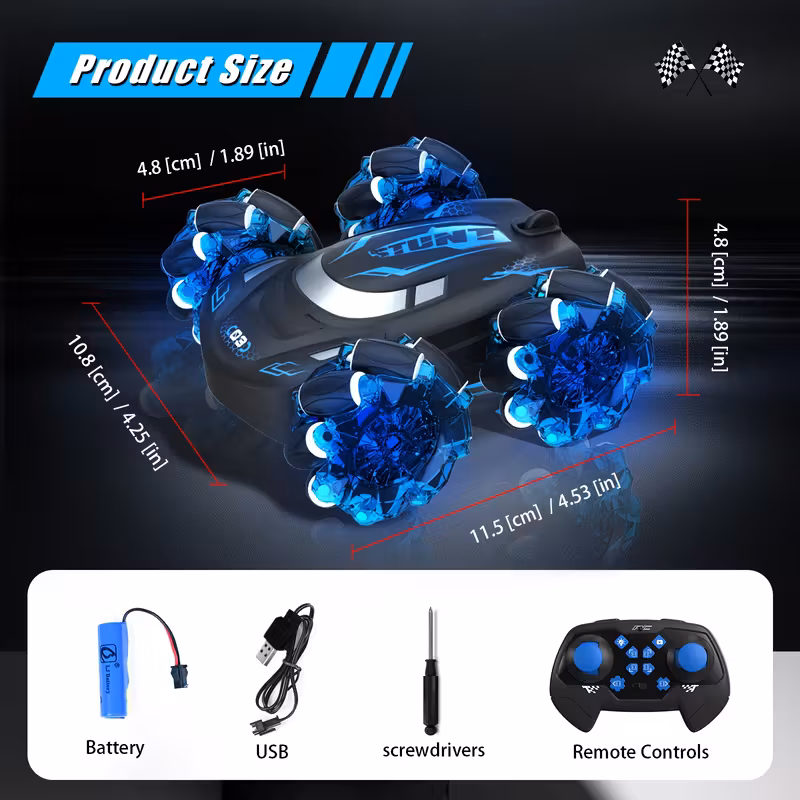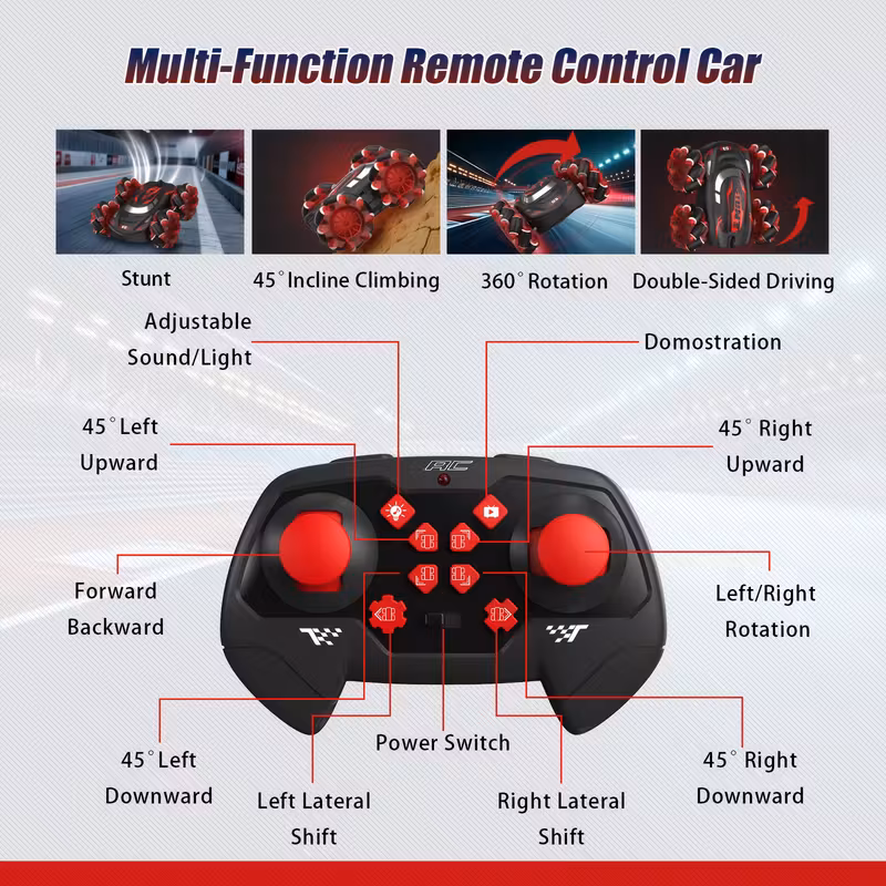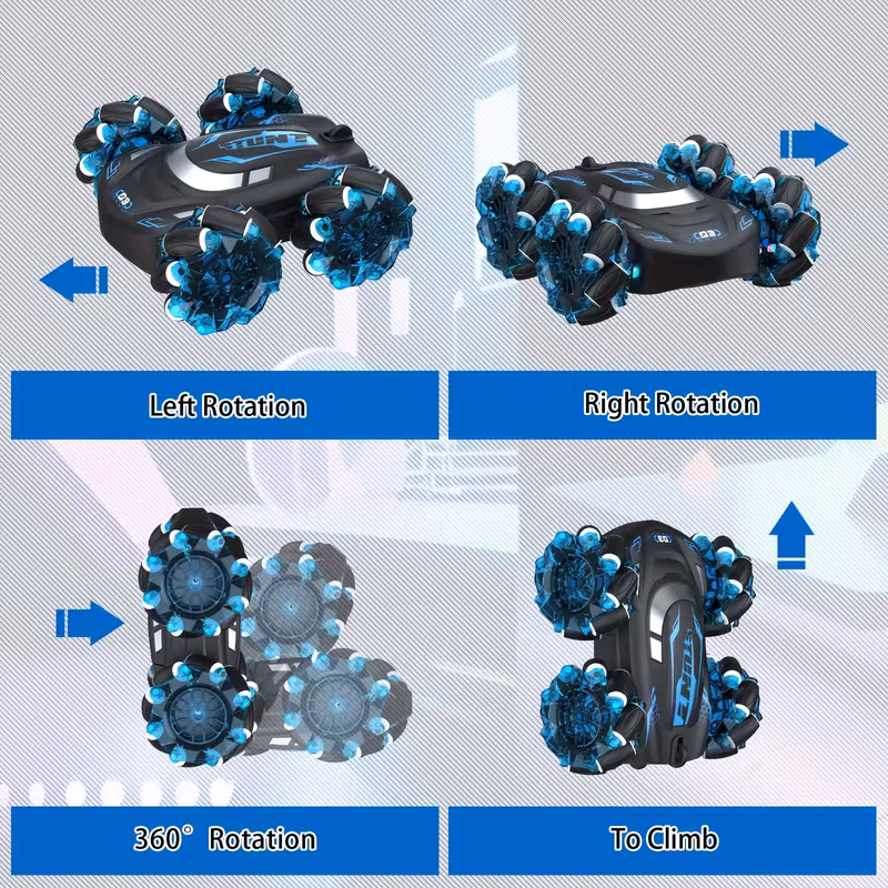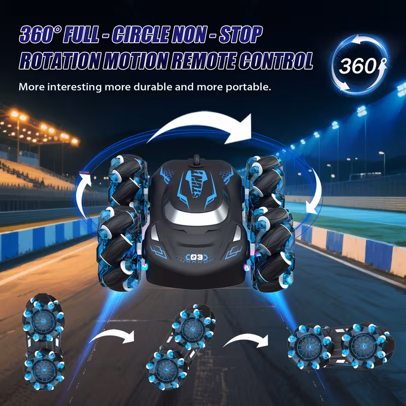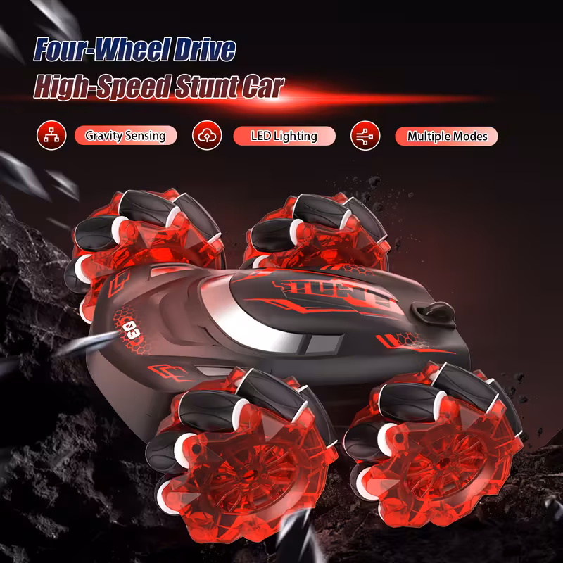 A standout feature is the optional Gravity Sensing Control, which allows the user to steer the car using natural hand gestures via a watch controller (if included), providing an immersive, cutting-edge driving experience. For maximum visual appeal, dynamic LED Lighting and adjustable sound effects enhance play, especially in low-light conditions. With multiple performance modes available directly on the Multi-Function Remote Control, this RC Stunt Car delivers a versatile, high-energy experience for all enthusiasts.